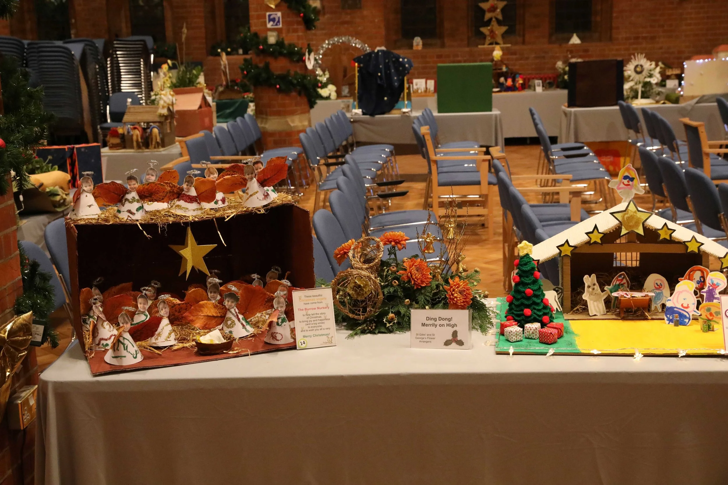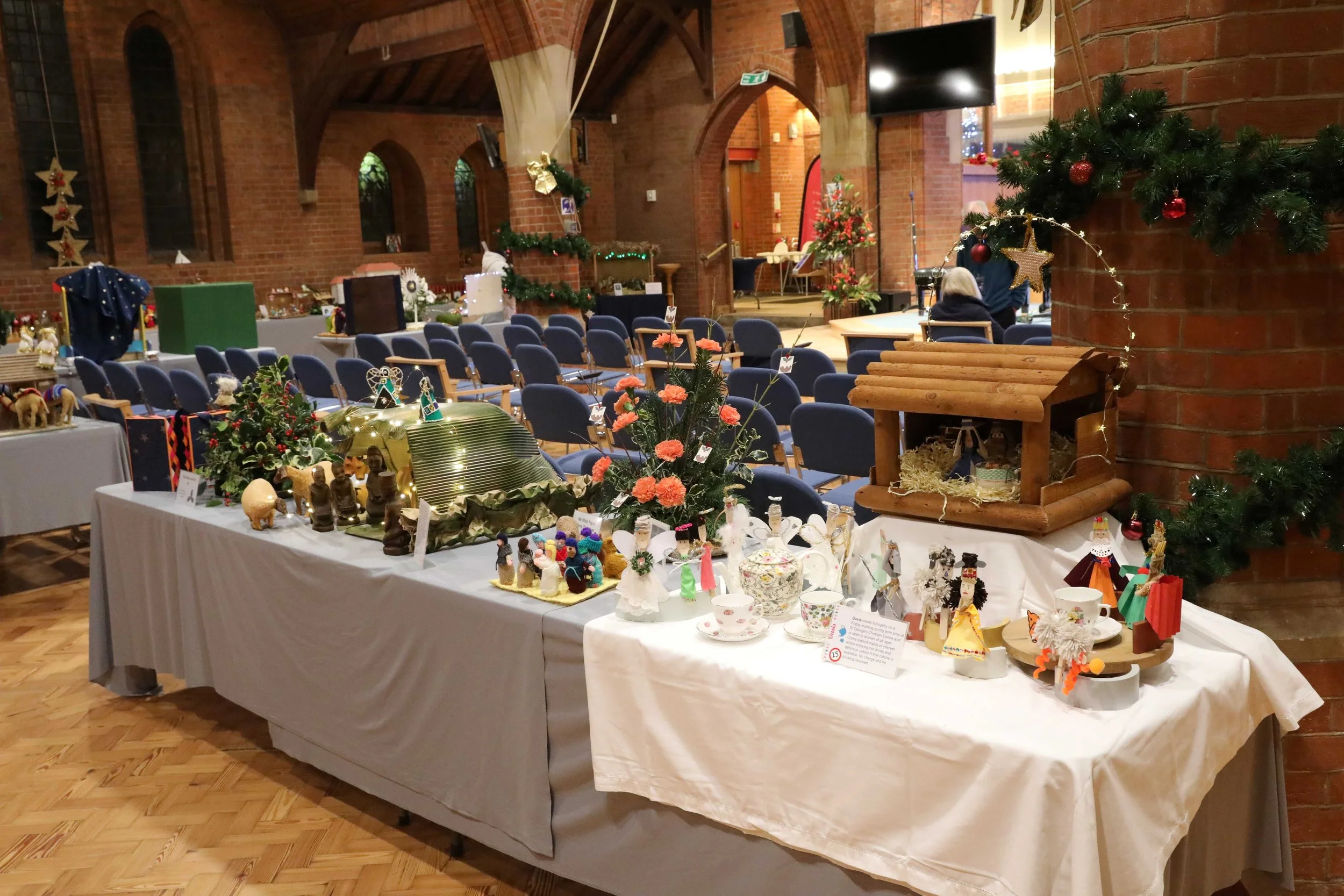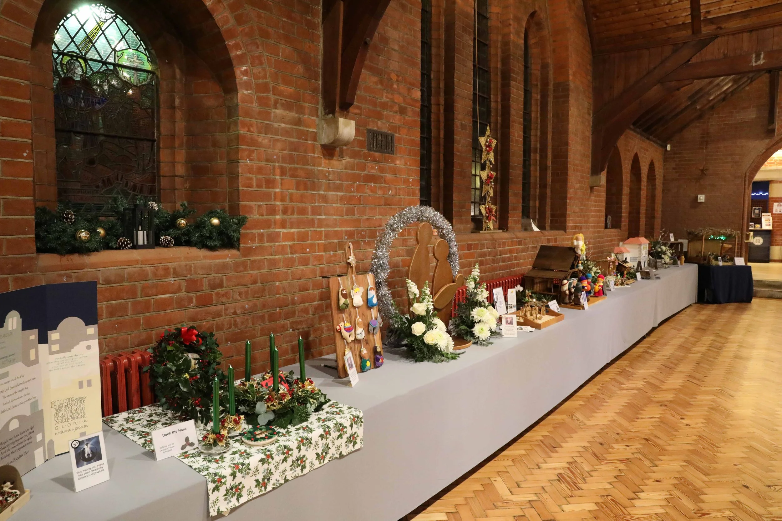 Between the cribs, beautiful floral arrangements added to the festive atmosphere. Each was inspired by a Christmas carol and lovingly created by members of the church’s flower‑arranging teams.